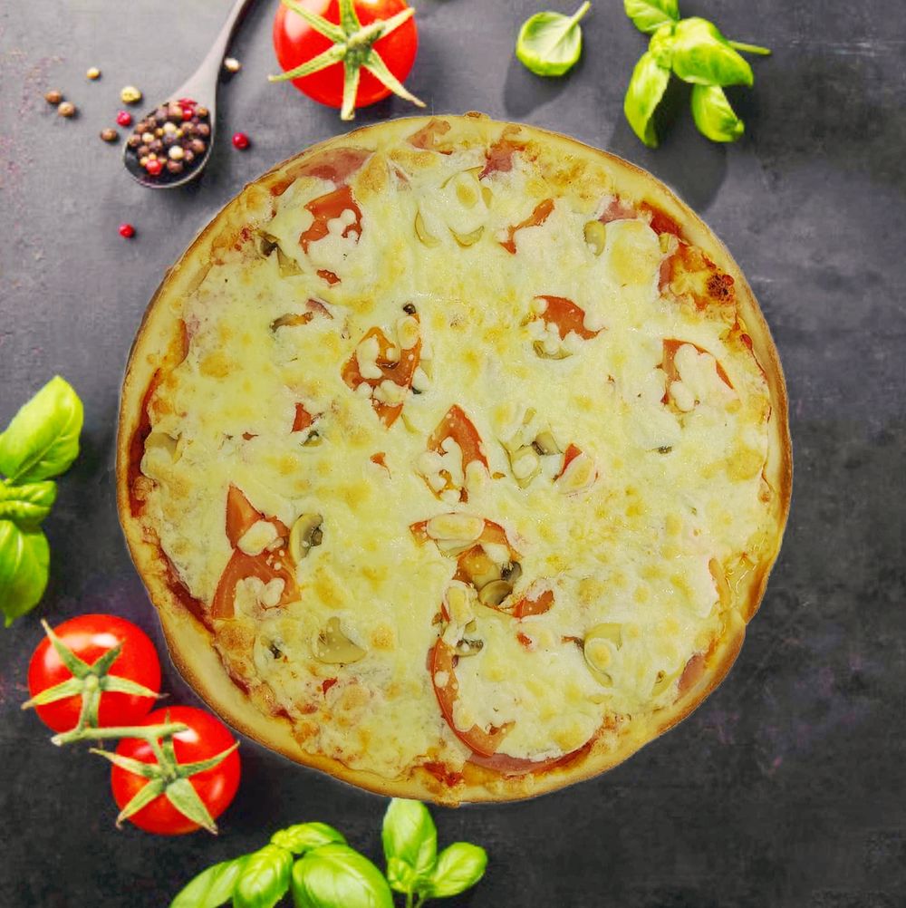 Пицца соус, ветчина, грибы шампиньоны, помидоры, сыр моцарелла.