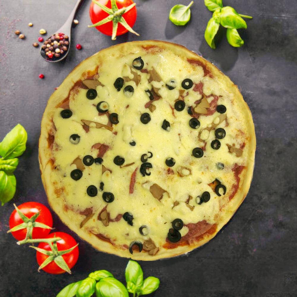 Пицца соус, колбаса полукопченая, грибы шампиньоны, ветчина, оливки, сыр моцарелла.