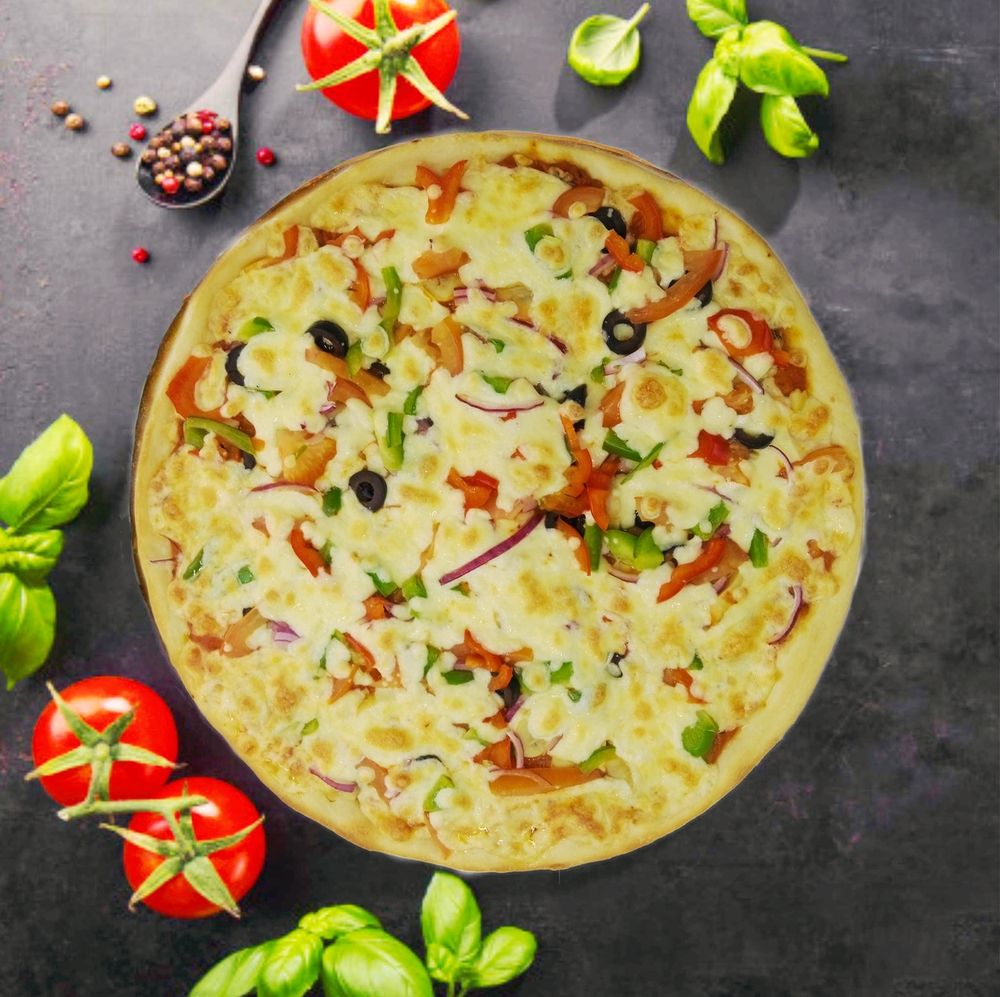 Пицца соус, перец болгарский, помидоры, грибы шампиньоны, оливки, лук красный, сыр моцарелла.