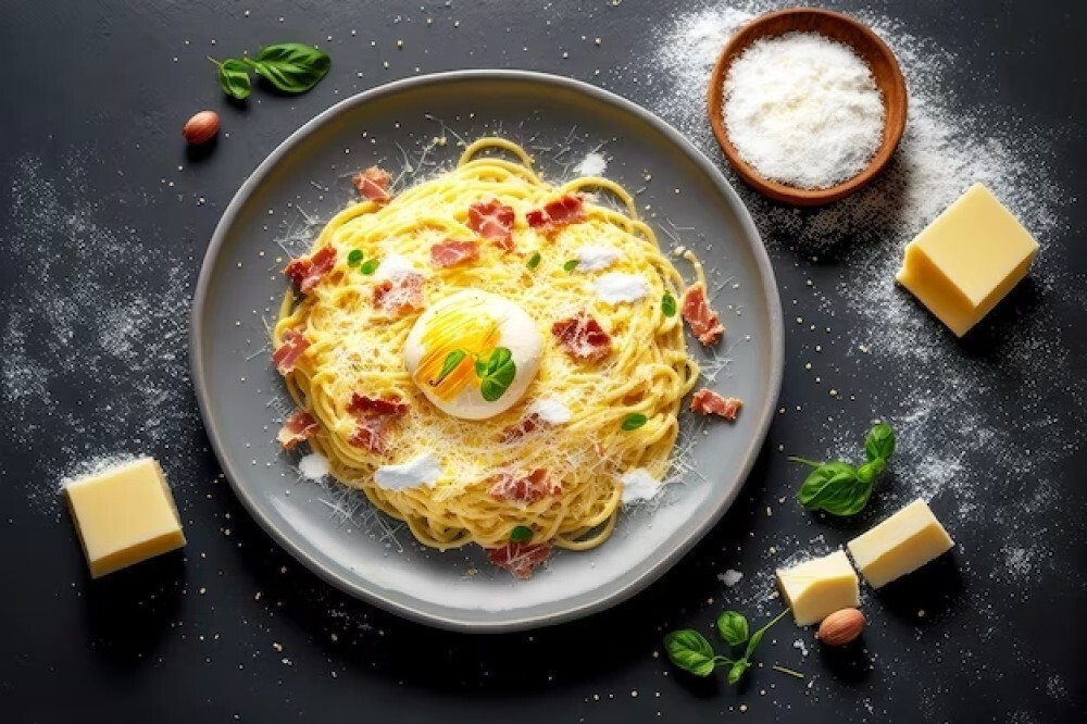 Спагетти, бекон, яичный желток, сыр пармезан, черри, сливки.