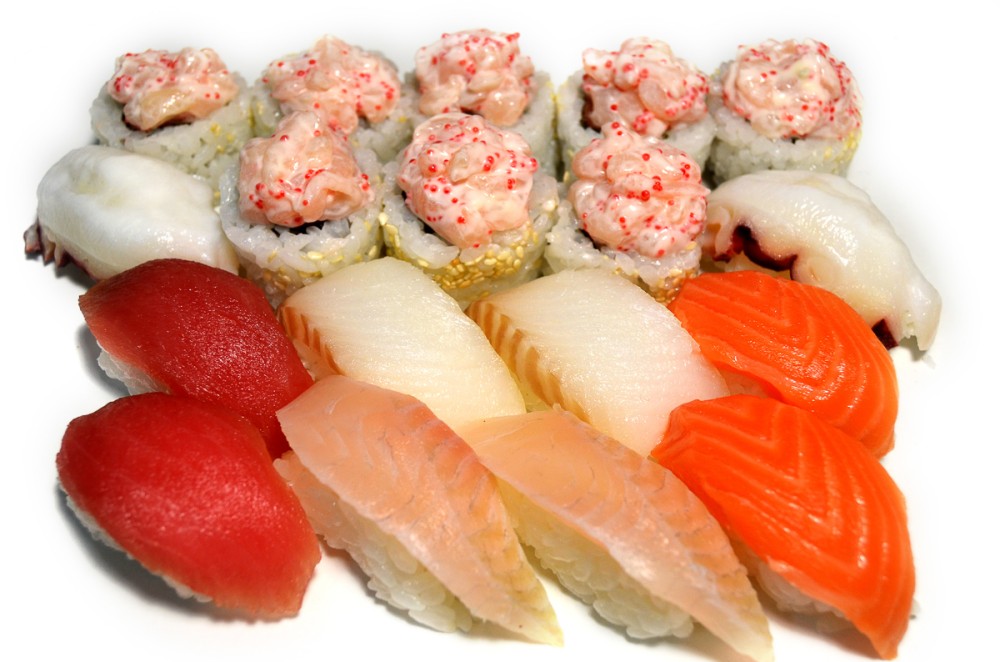 Суши по 2 шт. сяке, изумитай, магуро, тако, энгава, лава ролл. Имбирь, соевый соус, васаби не идет в комплекте, заказывать отдельно.