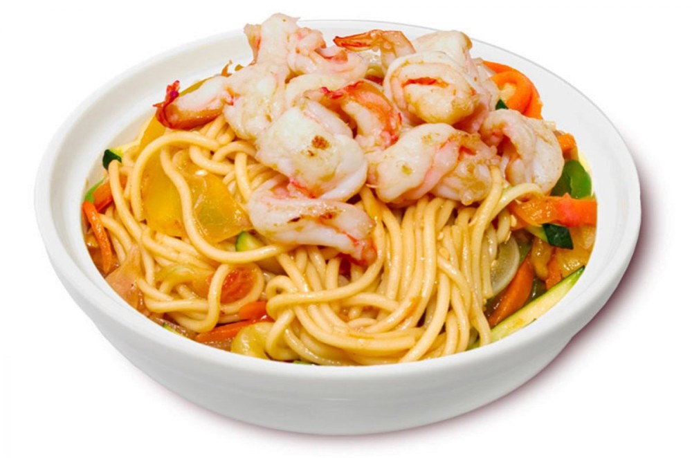 Яичная лапша, креветка варенная, болгарский перец, лук репчатый, шампиньоны свежие, соус сливочный.