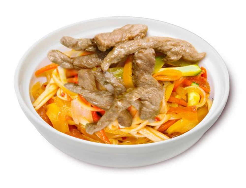 Пшеничная лапша, говядина, болгарский перец, лук репчатый, шампиньоны свежие, соус чили.