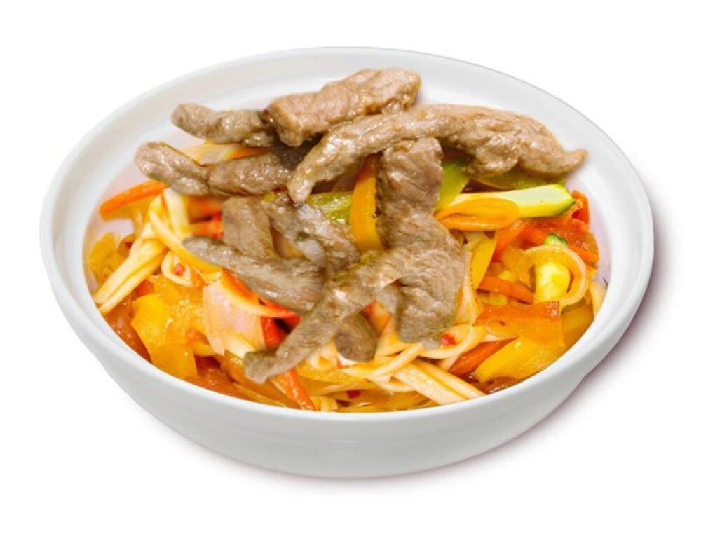 Пшеничная лапша, говядина, перец болгарский, лук, грибы, соус кисло-сладкий