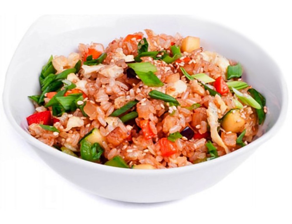 Рис, курица, яйцо, перец болгарский, грибы, соус Чили