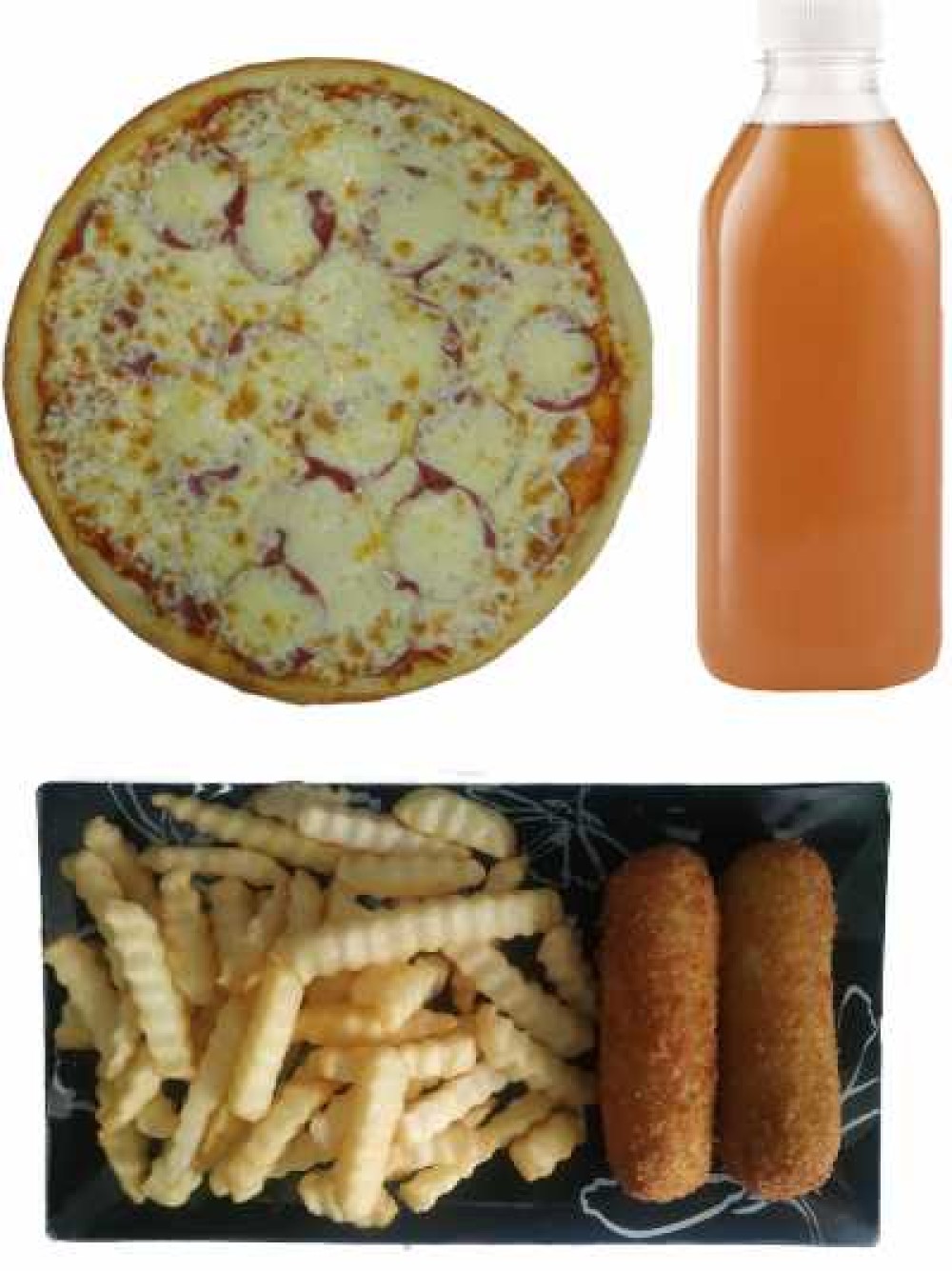 Пицца Богатырь мини 25х25см, картошка фри, корн дог, компот 1л