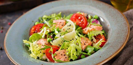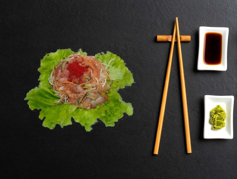 Лист салата, айсберг, овощи, лосось, тунец, окунь, гребешок, тобико, огурец, соус