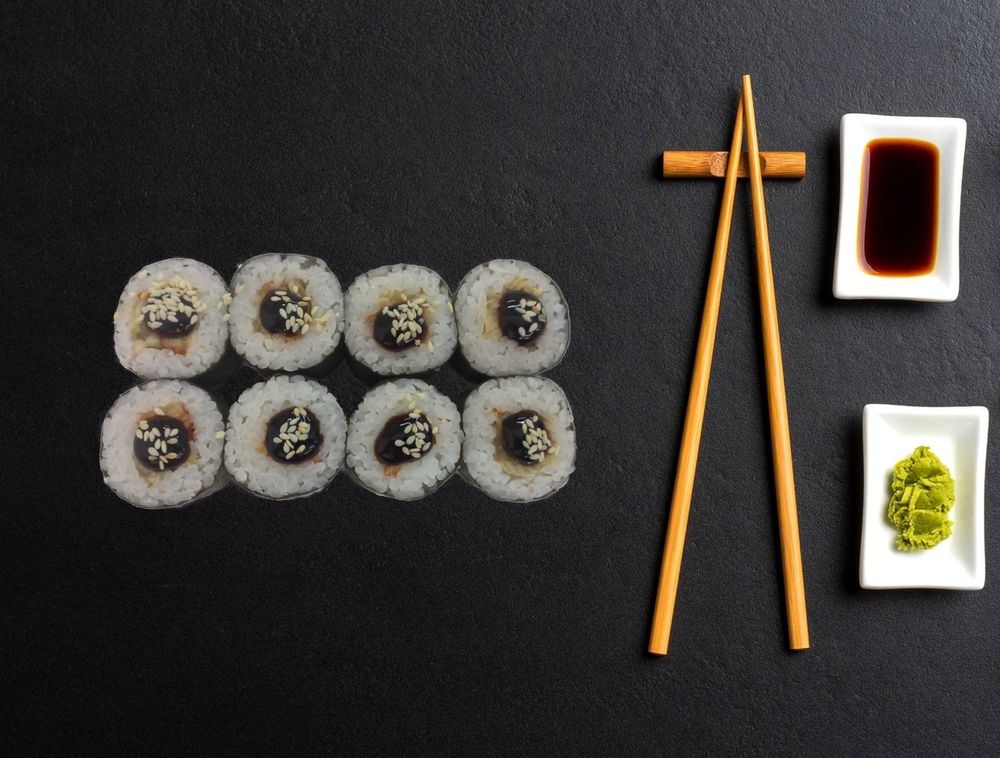 Рис, угорь, кунжут, унаги соус Имбирь, соевый соус, васаби не идет в комплекте, заказывать отдельно
