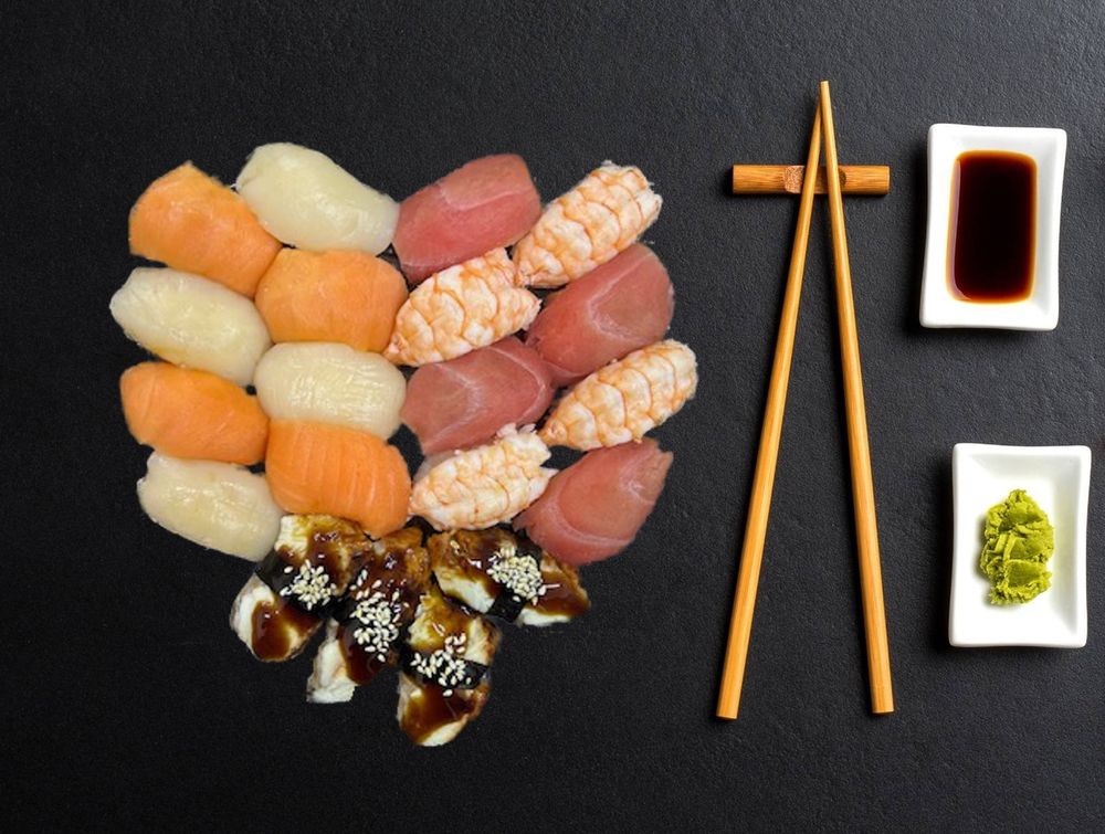 Семга суши 4шт, тунец суши 4шт, гребешок суши 4шт, угорь суши 4шт креветка суши 4 шт