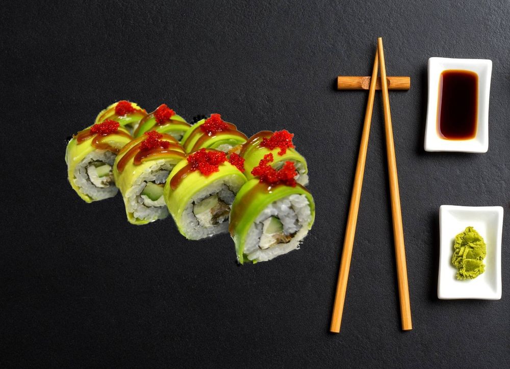 Ролл- авокадо, угорь, тобико, огурец,сыр творожный, соус, рис, соус унаги. Имбирь, соевый соус, васаби не идет в комплекте, заказывать отдельно.