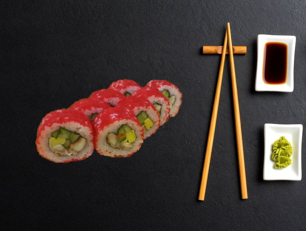 Ролл- угорь, тобико, огурец, рис. Имбирь, соевый соус, васаби не идет в комплекте, заказывать отдельно.