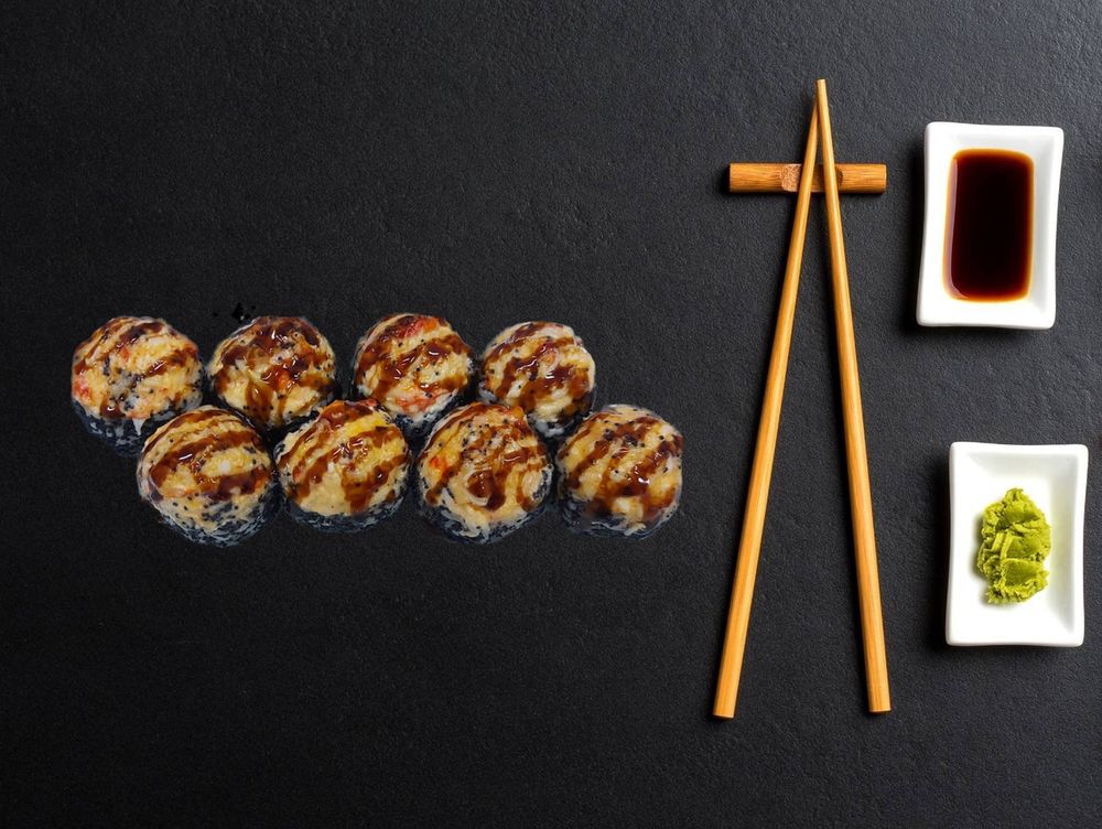 Ролл-кальмар, тобико, омлет, сыр творожный, огурец, рис, соус спайс, соус унаги. Имбирь, соевый соус, васаби не идет в комплекте, заказывать отдельно.