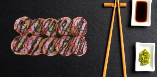 Окунь, тобико, сыр моцарелла, огурец, омлет, рис. Имбирь, соевый соус, васаби не идет в комплекте, заказывать отдельно.